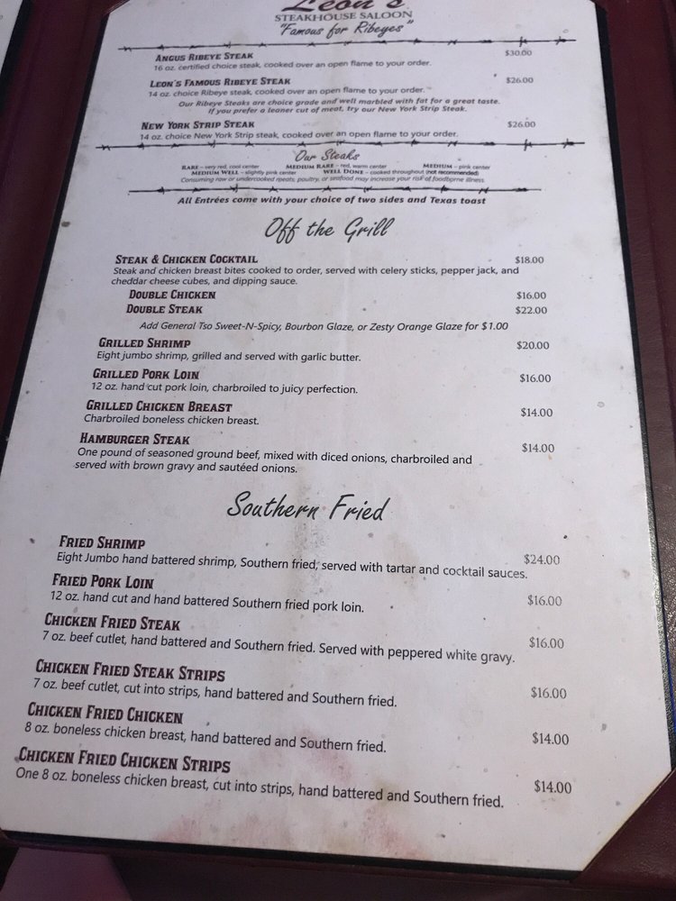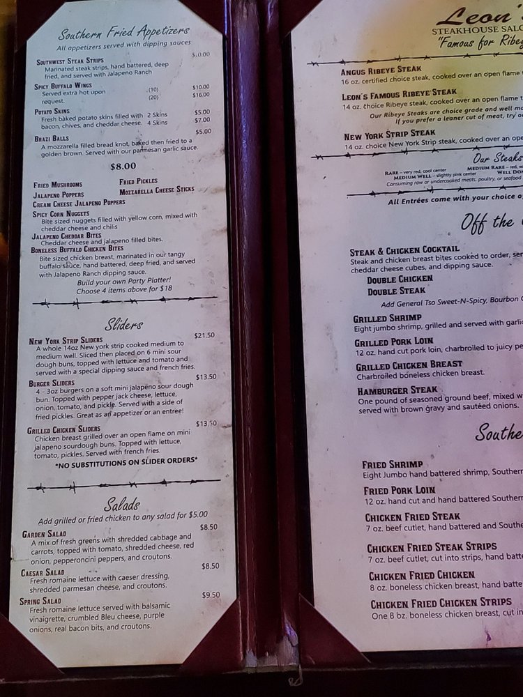 Welcome to Leon's Steakhouse & Saloon, where hearty flavors and a lively atmosphere come together in Longview, TX. The menu features top-notch steaks, highly praised by patrons for their perfect cooking and robust taste. Must-try items include the 10-ounce New York strip and the delightful hamburger steak, both known for their generous portions and quality.